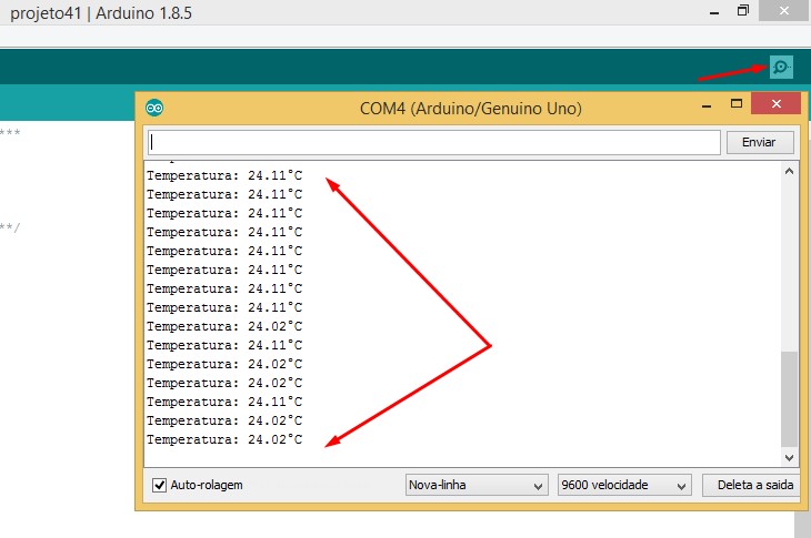 2. Para visualizar a leitura das temperaturas registradas, clique no ícone monitor serial, como mostra a figura abaixo: