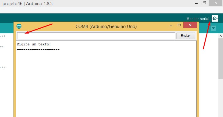 1. Ao executar o programa, abra o monitor serial do IDE do Arduino. Aguarde o monitor estar pronto para você digitar o texto.