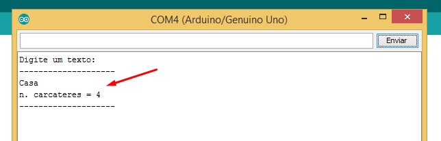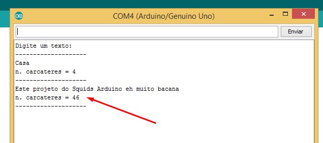 Obs.: Veja que o texto também aparece no monitor serial, assim como, o tamanho em número de caracteres.