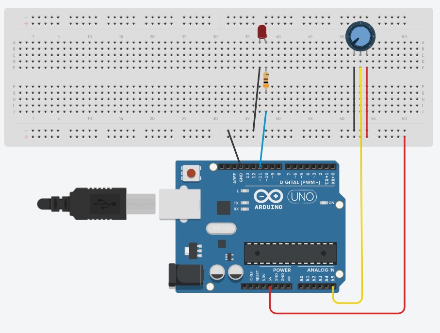 1.2. A constante Potenciometro se refere ao potenciômetro 10K (resistência máxima de 10KΩ) definido para estar conectado no pino analógico A5. A constante LedX se refere ao componente led 5mm de alto brilho que deve estar conectado no pino digital 11 (saída que pode ser utilizada como PWM).