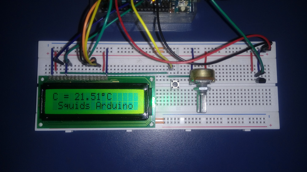 2.2.8. Finalmente, é exibida no display LCD a frase "Squids Arduino" através da função lcd.print("squids Arduino").
