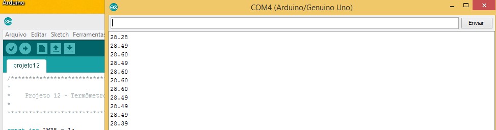 1. Ao rodar o programa, o software irá a medir a temperatura ambiente onde está localizado o sensor de temperatura LM35.