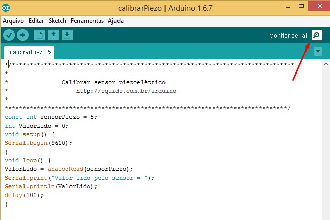 1. Faça o upload para o microcontrolador e abra o Monitor Serial para fazer a leitura do sensor piezoelétrico.