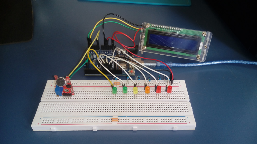 O objetivo deste projeto é criar um dispositivo para aferir a intensidade sonora e mostrar essa intensidade em um display LCD e/ou apenas ligando e desligando leds. Para isso, vamos utilizar um módulo sensor de som capaz de transformar qualquer variação sonora do ambiente em sinais. O Arduino ao receber e processar esses sinais, irá controlar os leds e/ou o display LCD conforme as diferentes frequências sonoras que receber. No projeto utilizamos o módulo KY-038, mas o resultado deverá ser semelhante para qualquer outro tipo de módulo sensor de som.