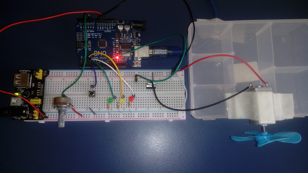 b2. No nosso projeto, dividimos o circuito em 2 partes. A primeira parte é alimentada diretamente pelo Arduino (5V) que inclui o potenciômetro e o botão para ligar o motor. A segunda parte controla a alimentação do motor e o transistor de proteção, onde utilizamos uma fonte ajustável de 5V com corrente máxima de 700mA.